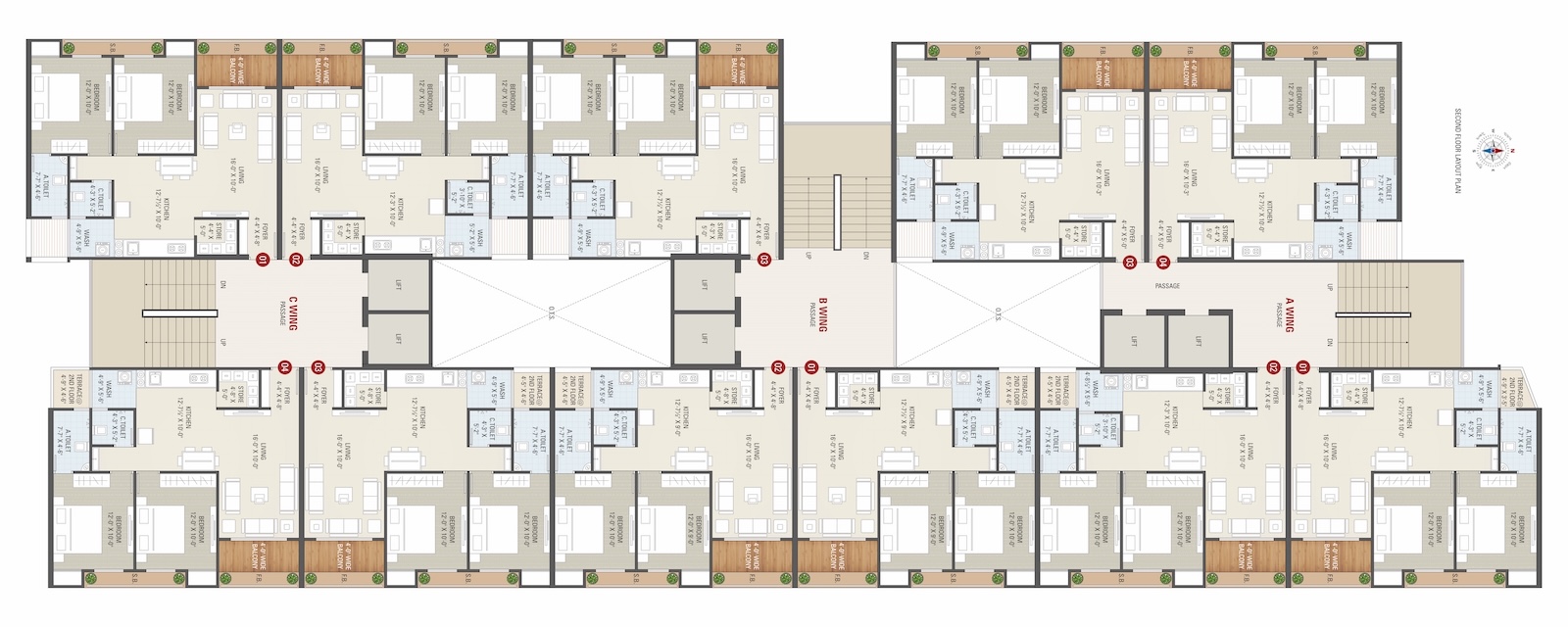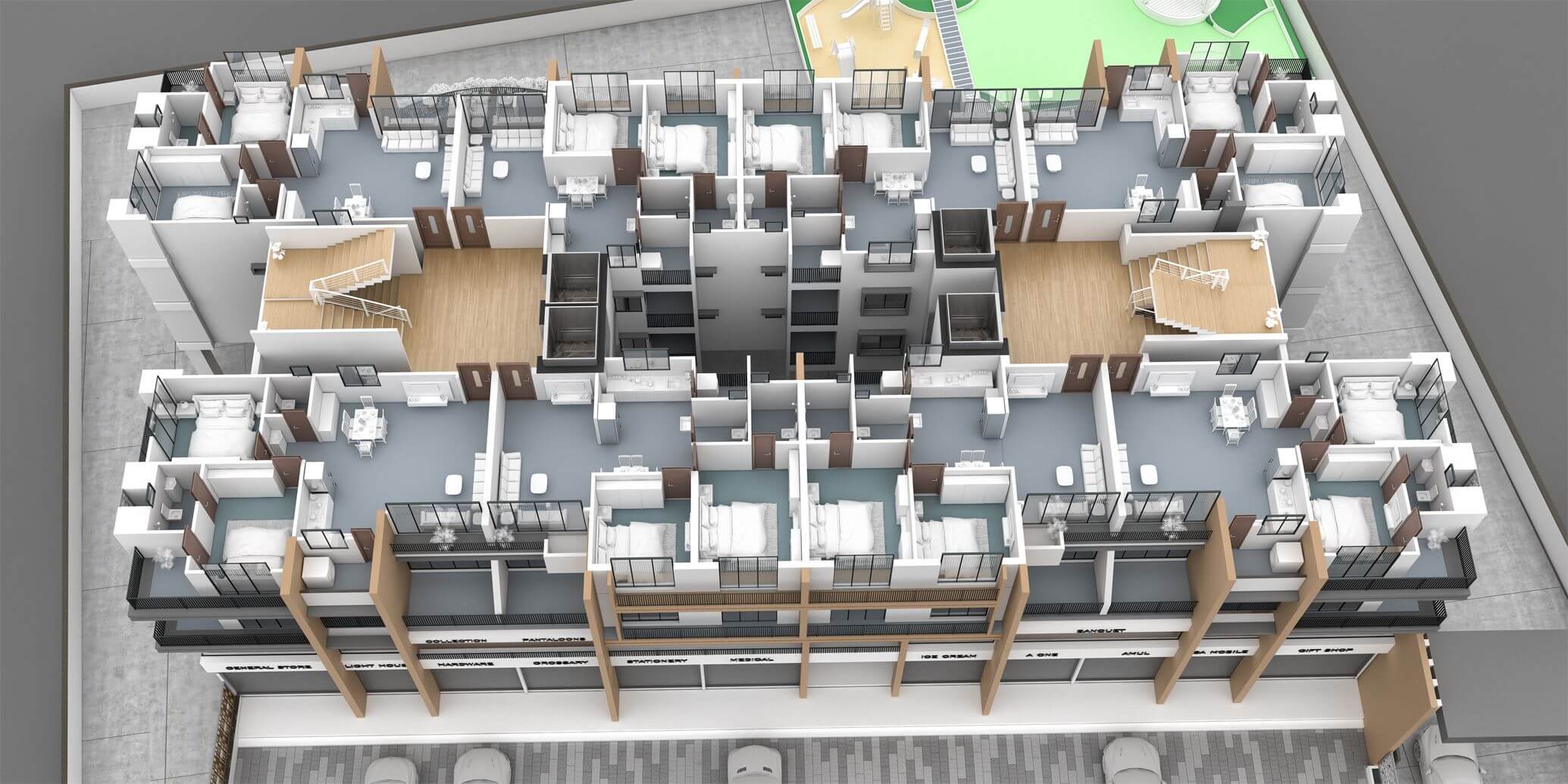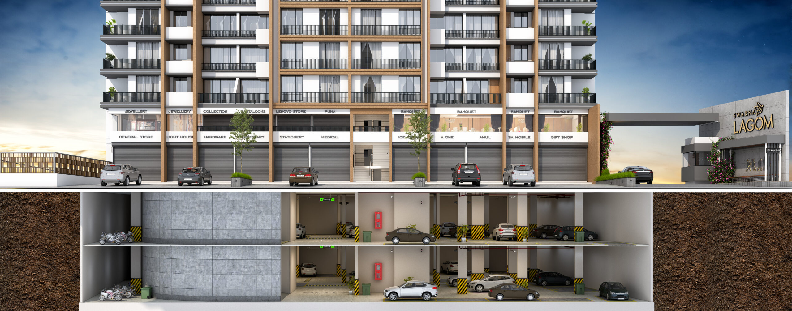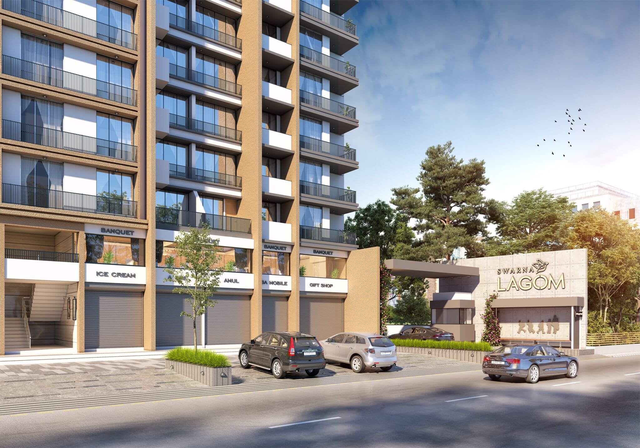 'SWARNA LAGOM' has been designed to create most functional apartments for 2BHK range. Most house hold functions have been accolated in different kind of 2BHK typologies. Swarna developers have been working closely with us to provide maximum amenities inside campus. Even terrace area has been utilized to furnish common amenities to actual users of the project. Exterior elevation elements have been conceptualizer via innovation and innovative process to invite maximum possible light and air ventilation in each apartment. Structure members have been shaped in such a way that, it avoids any kind of physical disturbance in usable spaces.